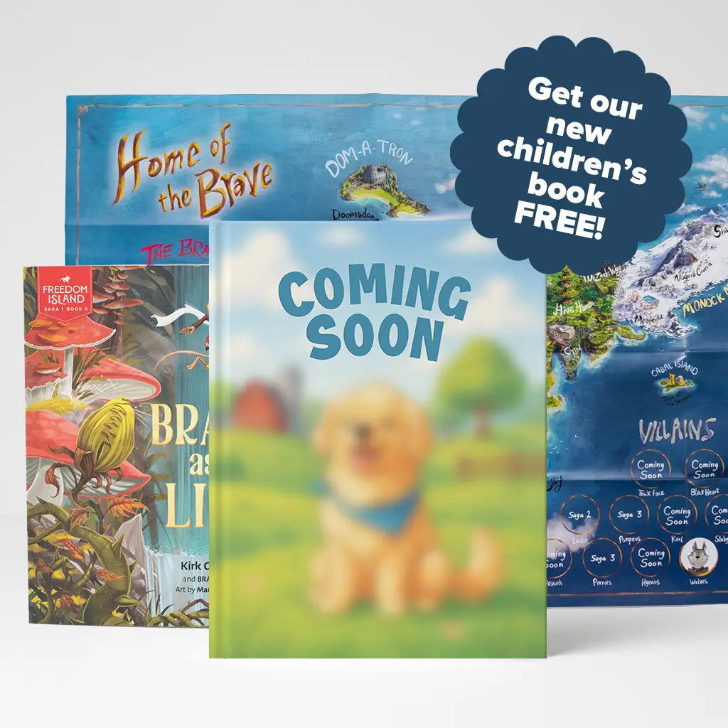 We ship a new book every month that's a part of our immersive world of Freedom Island. As soon as you sign up, you get FREE access to BRAVE+. Every book has games and activities in the back of the book for you and your kids to establish healthy habits around intentional time spent together.